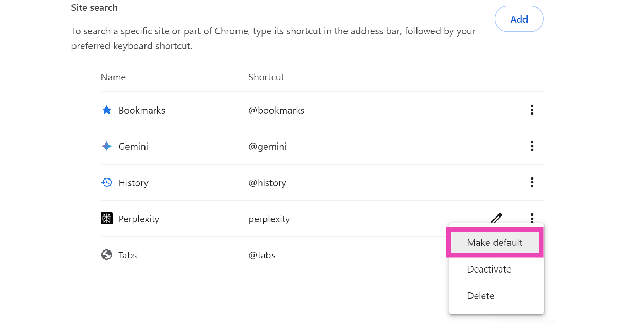 Μπορείτε να ορίσετε αμηχανία AI ως την προεπιλεγμένη μηχανή αναζήτησης στο Google Chrome πηγαίνοντας στο SETTINGS> Μηχανή αναζήτησης> Διαχείριση μηχανών αναζήτησης και αναζήτησης ιστότοπου> Προσθήκη, και την είσοδο https://www.perplexity.ai/?q=%s.