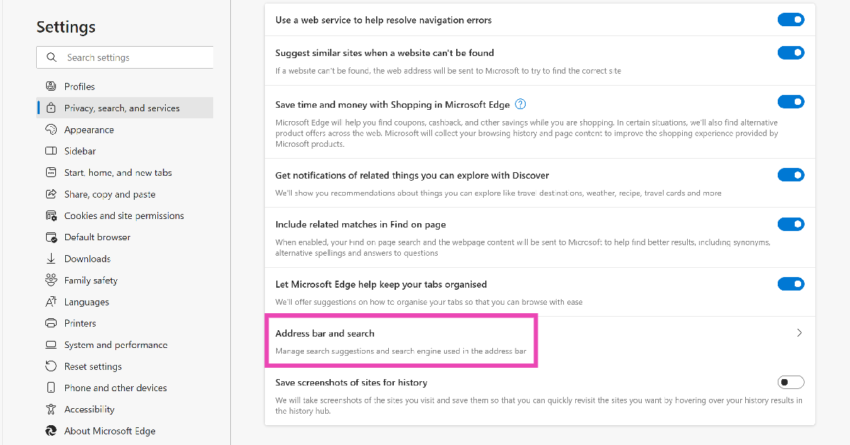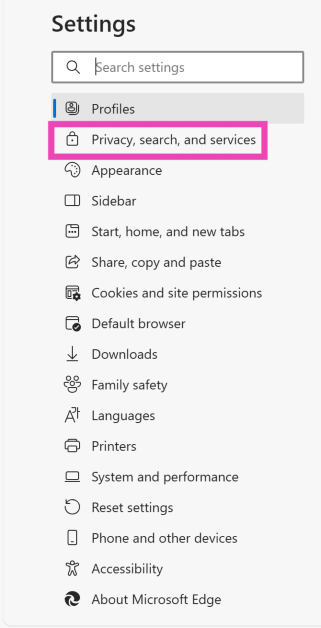 Βήμα 2:ΕπιλέγωΙδιωτικότητα, αναζήτηση και υπηρεσίεςαπό την πλαϊνή μπάρα.