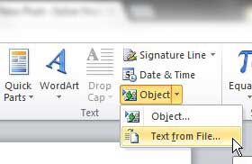 Βήμα 4: Κάντε κλικ στοΑντικείμενοαναπτυσσόμενο μενού στοΚείμενοΤμήμα της κορδέλας στο επάνω μέρος του παραθύρου και, στη συνέχεια, κάντε κλικ στοΚείμενο από αρχείοεπιλογή.