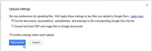 Βήμα 5: Κάντε κλικ στο μπλεΞεκινήστε τη μεταφόρτωσηκουμπί στο κάτω μέρος του παραθύρου. Σημειώστε ότι πρέπει επίσης να ελέγξετε το πλαίσιο στα αριστερά τουΜετατρέψτε τα έγγραφα, τις παρουσιάσεις, τα υπολογιστικά φύλλα και τα σχέδια στην αντίστοιχη μορφή Google Docs.