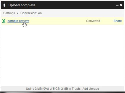 Βήμα 6: Κάντε κλικ στο όνομα του αρχείου στοΗ μεταφόρτωση ολοκληρώθηκεΤμήμα στη δεξιά πλευρά του παραθύρου για να ανοίξετε το αρχείο CSV που μεταφορτώθηκε στα Έγγραφα Google.