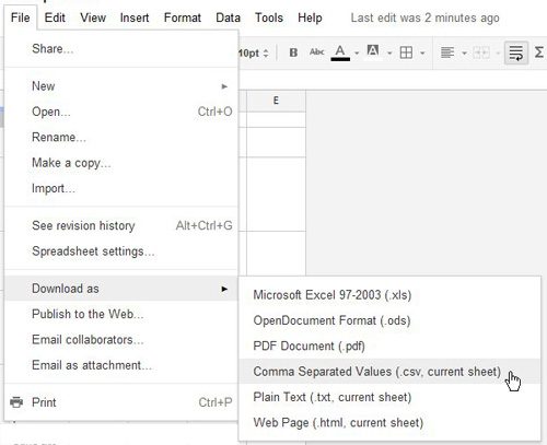 Βήμα 7: Μόλις ολοκληρώσετε την προβολή και την επεξεργασία του αρχείου στα Έγγραφα Google, μπορείτε να επιλέξετε να κατεβάσετε το υπολογιστικό φύλλο ως αρχείο CSV. ΚλικΑρχείοΣτην κορυφή του παραθύρου, τότεΛήψη ως, στη συνέχεια κάντε κλικ στοΤιμές διαχωρισμένες με κόμματαεπιλογή.