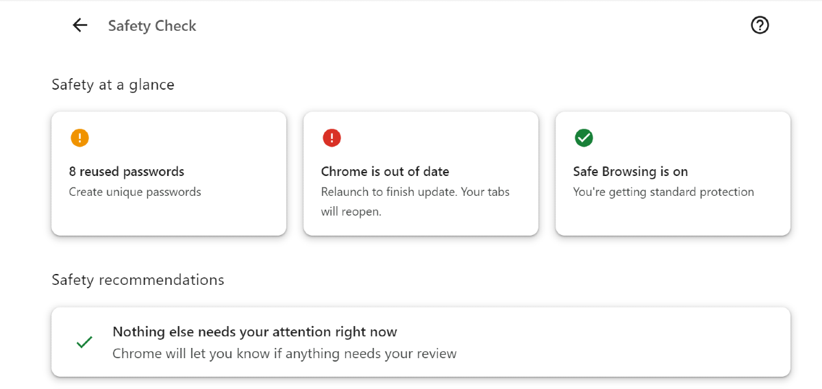 Εάν υπάρχει κάποια λήψη στην ασφάλεια, ο έλεγχος ασφαλείας θα επισημάνει αυτό το ζήτημα και θα σας ενημερώσει για τον ίδιο τον πίνακα ελέγχου. Φυσικά, υπάρχουν περισσότερα βήματα που μπορείτε να κάνετε για να ενισχύσετε την ασφάλεια του προγράμματος περιήγησης, αλλά αυτό είναι ένα καλό σημείο εισόδου στην άσκηση.