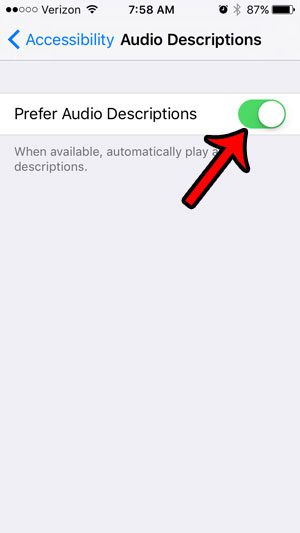 Βήμα 5: Πατήστε το κουμπί στα δεξιάΠροτιμούν περιγραφές ήχουγια να το ενεργοποιήσετε. Θα γνωρίζετε ότι η ρύθμιση είναι ενεργοποιημένη όταν υπάρχει πράσινη σκίαση γύρω από το κουμπί. Οι περιγραφές ήχου είναι ενεργοποιημένες στην παρακάτω εικόνα.