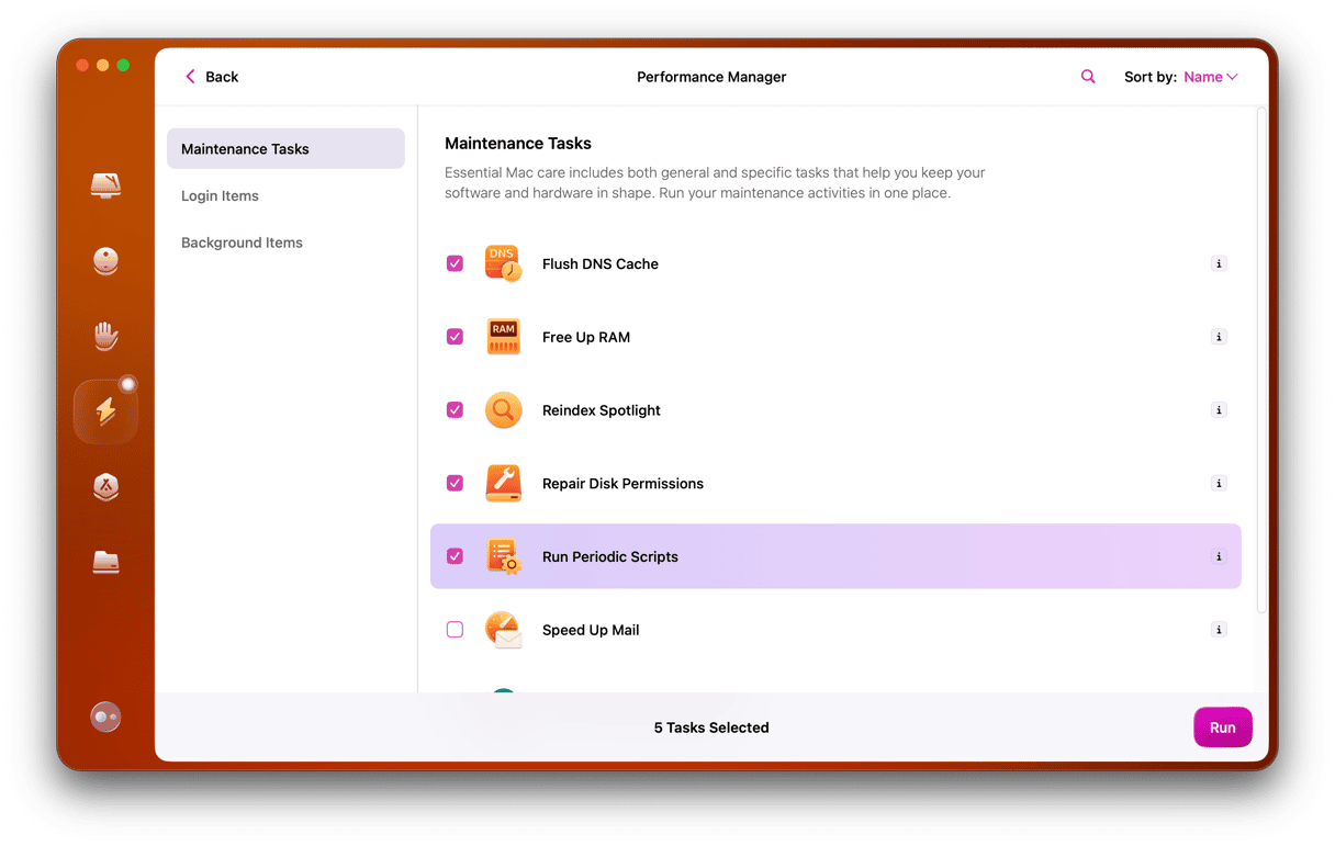 Ένας από τους καλύτερους τρόπους για να γίνει αυτό είναι να πραγματοποιήσετε εργασίες συντήρησης, όπως η εκτέλεση σεναρίων συντήρησης MacOS, η ανανέωση του προβολέα, η απελευθέρωση της μνήμης RAM και η εκκαθάριση της cache DNS. Κάνοντας όλα αυτά με το χέρι, όμως, είναι χρονοβόρο και δύσκολο. Και εκεί μπαίνει στο παιχνίδι η μονάδα συντήρησης του CleanMyMac. Μπορεί να εκτελέσει όλες αυτές τις εργασίες, καθώς και λεπτή μηχανή χρόνου, να επισκευάσει τα δικαιώματα δίσκου και να επιταχύνει το ταχυδρομείο, με μόνο μερικά κλικ.