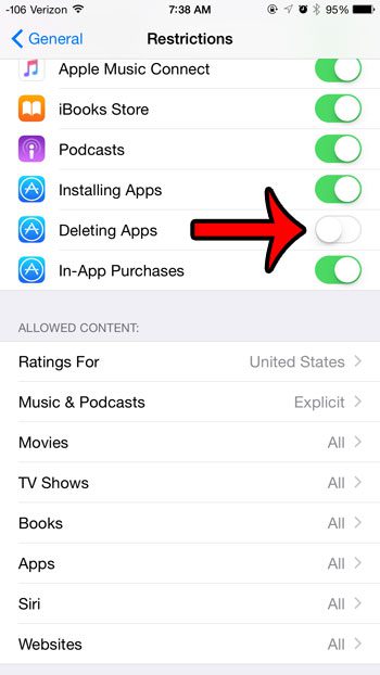 - Βήμα 7: Μετακινηθείτε προς τα κάτω και πατήστε το κουμπί στα δεξιάΔιαγραφή εφαρμογώνΓια να απενεργοποιήσετε την επιλογή. Θα γνωρίζετε ότι η διαγραφή της εφαρμογής έχει απενεργοποιηθεί όταν δεν υπάρχει πράσινη σκίαση γύρω από το κουμπί. Για παράδειγμα, η επιλογή διαγραφής εφαρμογών είναι απενεργοποιημένη στην παρακάτω εικόνα.