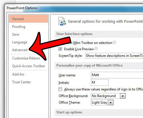 Βήμα 4: Κάντε κλικΠροχωρημένοςστη στήλη στην αριστερή πλευρά τουΕπιλογές PowerPointπαράθυρο.