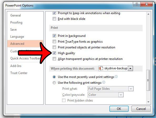 Εάν επιθυμείτε να εκτυπώσετε μια παρουσίαση σε χαμηλότερη ποιότητα, τότε μπορείτε να το κάνετε κάνοντας κλικ στοΠλήρεις σελίδες διαφάνειεςκάτω από το κουμπίΡυθμίσειςστοΑποτύπωμαμενού και, στη συνέχεια, κάντε κλικ στοΥψηλής ποιότηταςεπιλογή για απενεργοποίηση.