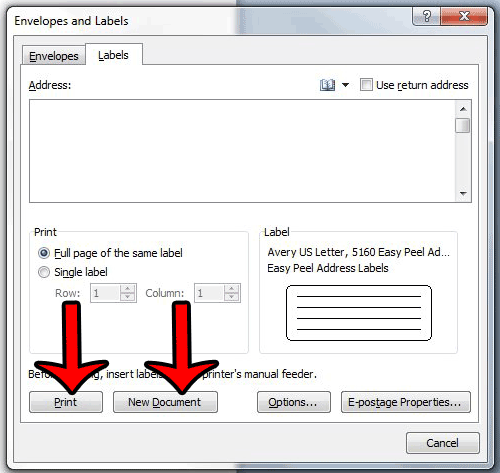 Στη συνέχεια, μπορείτε να εισαγάγετε τα στοιχεία της ετικέτας διευθύνσεών σας στοΔιεύθυνσηπεδίο στο επάνω μέρος του παραθύρου και κάντε κλικ στο κουμπί εκτύπωσης όταν τελειώσετε. Ή μπορείτε να κάνετε κλικ στοΝέο έγγραφοκουμπί για να ανοίξετε ένα κενό πρότυπο εγγράφου για τις ετικέτες που προσπαθείτε να εκτυπώσετε.