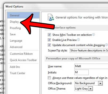 Βήμα 4: Κάντε κλικ στοΕπίδειξηκαρτέλα στην αριστερή πλευρά τουΕπιλογές λέξεωνπαράθυρο.