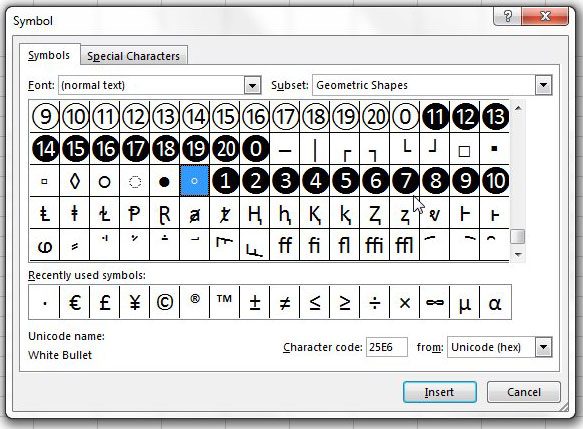 Μπορείτε να χρησιμοποιήσετε διαφορετικά αντικείμενα ως σφαίρες επιλέγοντάς τα από τοΣύμβολαμενού στοΕισάγωκαρτέλα επίσης, κάνοντας κλικ σε ένα σύμβολο στο μενού και, στη συνέχεια, κάνοντας κλικ στοΕισάγωκουμπί για να το εισαγάγετε στο κελί.