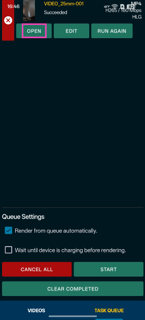 Βήμα 9:Μεταβείτε στοΚαρτέλα ουρά εργασιώνγια να δείτε τη διαδικασία απόδοσης. Μόλις γίνει το βίντεο, πατήστεΑνοιχτό. Μπορείτε επίσης να βρείτε το Raw Video στην εφαρμογή Gallery Gallery του τηλεφώνου σας.