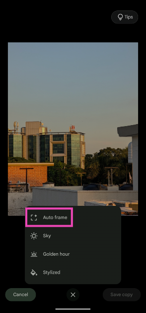 Το εργαλείο αυτόματου πλαισίου αποτελεί μέρος του Magic Editor. Για να αποκτήσετε πρόσβαση σε αυτό, ανοίξτε μια εικόνα στην εφαρμογή φωτογραφιών, πατήστε 'Επεξεργασία', πατήστε το εικονίδιο Magic Editor στην κάτω αριστερή γωνία της οθόνης και πατήστε το εικονίδιο προτάσεων στο κάτω μέρος.
