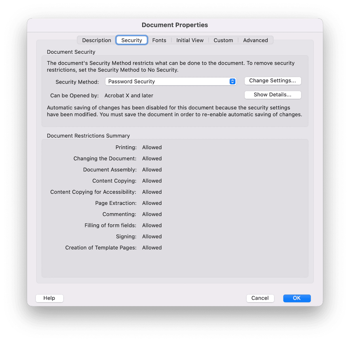 - Πατήστε το Command-D για να δείτε τις επιλογές ασφαλείας ή κάντε κλικ στο αρχείο> Ιδιότητες εγγράφων.