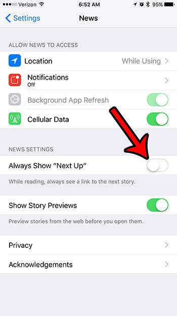 Αλλά αυτή η μπάρα με τον σύνδεσμο "επόμενο επάνω" μπορεί να πάρει πολύ χώρο στην οθόνη και, σε ορισμένες περιπτώσεις, δυσκολεύει να εκτελέσει ορισμένους τύπους πλοήγησης. Ευτυχώς το iPhone περιλαμβάνει επιλογές που σας επιτρέπουν να προσαρμόσετε μερικές από τις συμπεριφορές στην εφαρμογή ειδήσεων, συμπεριλαμβανομένης της προβολής αυτής της ράβδου και του συνδέσμου. Συνεχίστε λοιπόν να διαβάζετε παρακάτω για να δείτε πώς μπορείτε να απενεργοποιήσετε αυτήν τη λειτουργία για την εφαρμογή ειδήσεων.