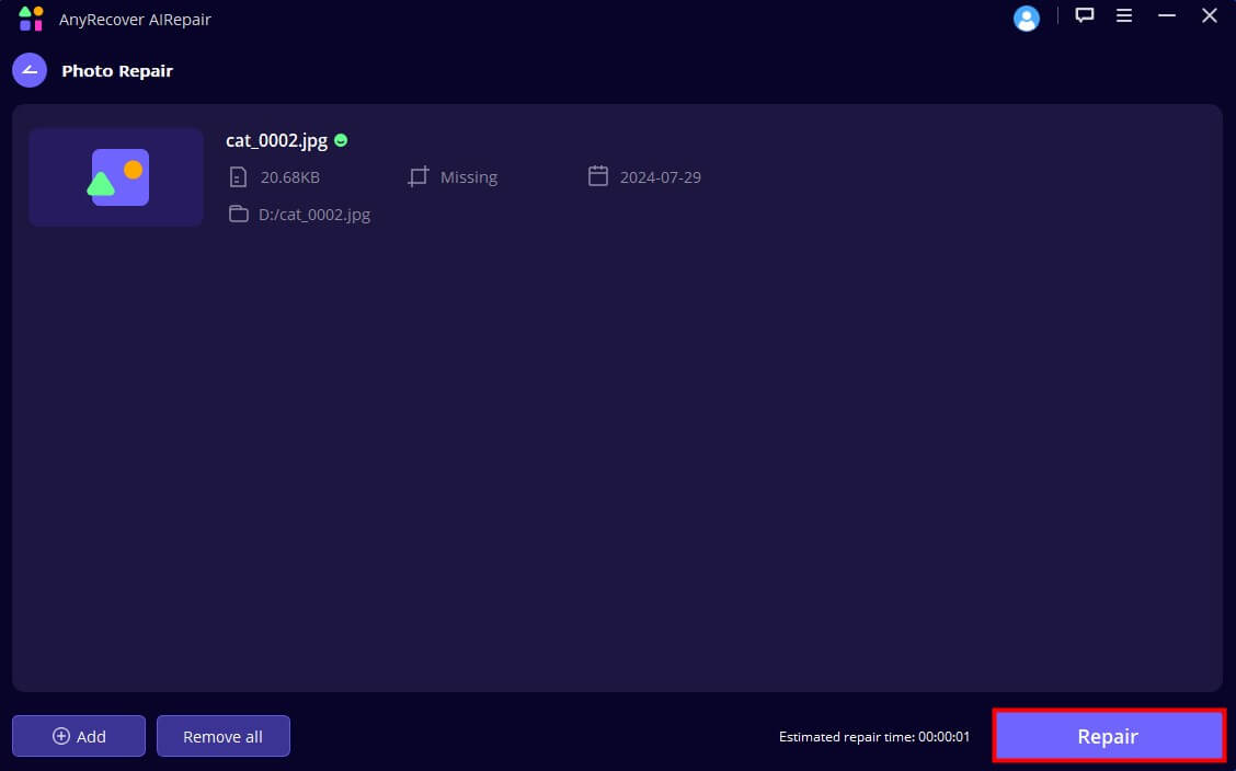 Βήμα 2:Επιλέξτε τις παλιές ή κατεστραμμένες φωτογραφίες που θέλετε να επισκευάσετε. Μπορείτε να επιλέξετε πολλές φωτογραφίες ταυτόχρονα. Περιμένετε να ολοκληρώσετε τις φωτογραφίες και κάντε κλικ στο ""Επισκευή"Κουμπί για να ξεκινήσετε τη διαδικασία επισκευής.