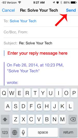 Βήμα 5: Εισαγάγετε το μήνυμα απάντησής σας στο σώμα του μηνύματος ηλεκτρονικού ταχυδρομείου και, στη συνέχεια, αγγίξτε τοΣτέλνωεικονίδιο στην επάνω δεξιά πλευρά της οθόνης.