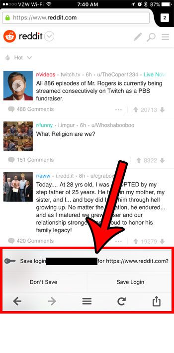 Στη συνέχεια, όταν εισάγετε ένα όνομα χρήστη και κωδικό πρόσβασης για έναν ιστότοπο και συνδεθείτε, θα δείτε μια γκρίζα μπάρα στο κάτω μέρος της οθόνης που ρωτάει αν θέλετε να αποθηκεύσετε τις πληροφορίες σύνδεσης. Ένα παράδειγμα αυτής της οθόνης εμφανίζεται στην παρακάτω εικόνα.