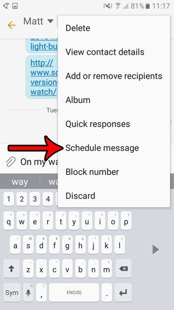 Αυτή η μέθοδος λαμβάνει χώρα στην εφαρμογή προεπιλεγμένων μηνυμάτων στο τηλέφωνο και ακολουθεί πολλά από τα ίδια βήματα που θα χρησιμοποιούσατε για να στείλετε ένα κανονικό μήνυμα κειμένου. Ωστόσο, μπορείτε να επιλέξετε μια ξεχωριστή επιλογή μηνύματος προγράμματος όπου μπορείτε να καθορίσετε την ώρα και την ημερομηνία του μηνύματος. Το Android θα προχωρήσει στη συνέχεια για να στείλει το μήνυμα τη στιγμή που θα επιλέξετε.