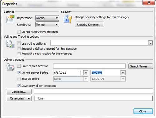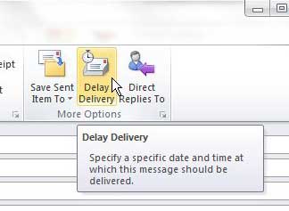 Για παράδειγμα, μπορείτε να χρησιμοποιήσετε το Outlook 2010 για να προγραμματίσετε την αποστολή ενός email σε μια συγκεκριμένη στιγμή στο μέλλον. Η δυνατότητα καθυστέρησης της παράδοσης μηνυμάτων στο Outlook 2010 όπως αυτή διασφαλίζει ότι μπορείτε να δημιουργήσετε ένα email τώρα, αλλά να το στείλετε σε πιο κατάλληλη στιγμή αργότερα.
