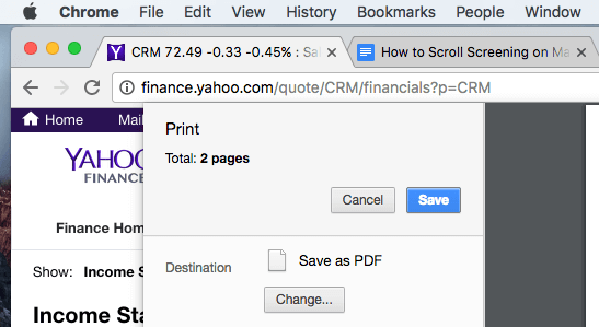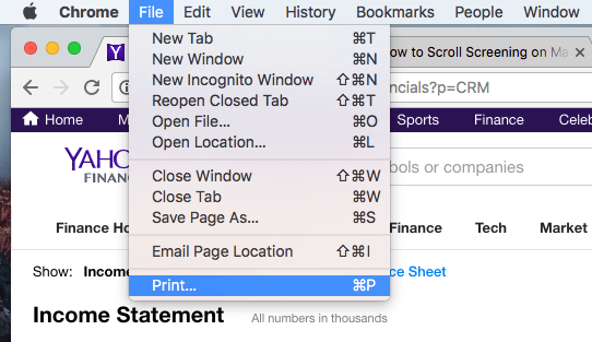 Ας υποθέσουμε ότι θέλετε να εξαγάγετε, ας πούμε, ένα δελτίο αποδείξεων από το Yahoo Finance. Πρώτον, ανοίξτε τη σελίδα σε ένα πρόγραμμα περιήγησης ιστού. Εδώ, χρησιμοποιώ το Chrome στο Mac μου ως παράδειγμα.
