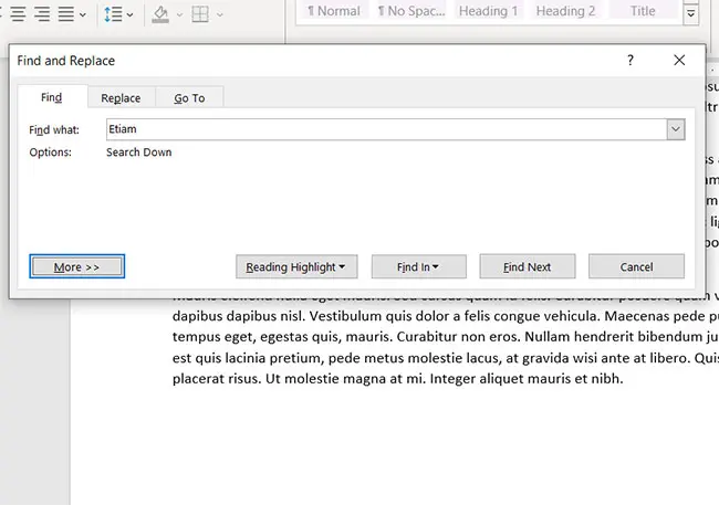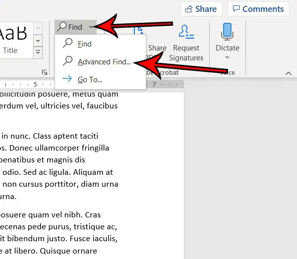 Σημειώστε ότι υπάρχουν κάτω βέλη στα δεξιά του κουμπιού εύρεσης και το κουμπί επιλογής σε αυτή την ενότητα που μπορείτε να χρησιμοποιήσετε για άλλες επιλογές. Για παράδειγμα, υπάρχει έναΠροχωρημένο εύρημαεπιλογή στοΕύρημαDrop Down Menu που μπορείτε να χρησιμοποιήσετε για πρόσθετες επιλογές αναζήτησης για να εντοπίσετε μια συγκεκριμένη λέξη ή λέξεις στο έγγραφο.