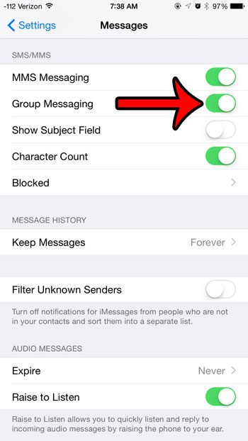 Εάν αντιμετωπίζετε πρόβλημα με την αποστολή ενός ομάδας, τότε επιβεβαιώστε ότι η επιλογή είναι ενεργοποιημένη στο δικό σαςΜηνύματαΡυθμίσεις. Μπορείτε να βρείτε αυτήν την επιλογή κάτωΡυθμίσεις> μηνύματα. Τότε απλά ενεργοποιήστε τοΟμαδικά μηνύματαεπιλογή. Θα γνωρίζετε ότι είναι ενεργοποιημένο όταν υπάρχει πράσινη σκίαση γύρω από το κουμπί. Για παράδειγμα, η επιλογή είναι ενεργοποιημένη στην παρακάτω εικόνα.