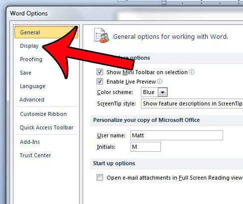 Είναι δυνατόν να ενεργοποιήσετε όλα τα σημάδια μορφοποίησης στο Word 2010, τροποποιώντας μια ρύθμιση στο παράθυρο επιλογών λέξεων. Μόλις πραγματοποιήσετε την αλλαγή που περιγράφεται στα παρακάτω βήματα, θα εμφανιστούν στην οθόνη οποιαδήποτε σημάδια μορφοποίησης που περιλαμβάνονται στο έγγραφό σας.