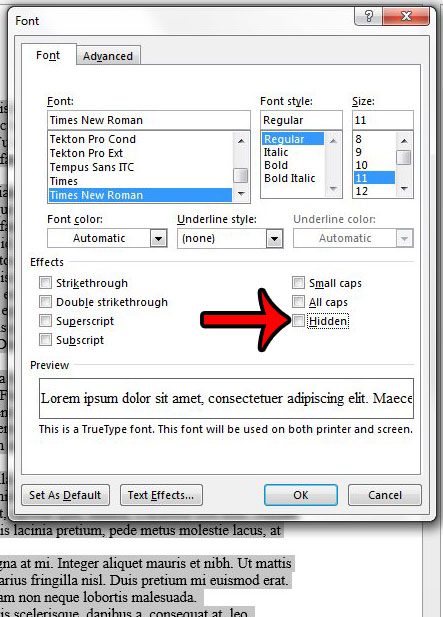 Εναλλακτικά, αν θέλετε να αποκρύψετε κείμενο, η μέθοδος για αυτό είναι πολύ παρόμοια με τα βήματα που μόλις εκτελέσατε για να το ξεπεράσετε. Μάθετε σχετικά με τη μορφοποίηση κρυμμένου κειμένου στο Word 2013 για να το κρατήσετε στο έγγραφο, αλλά να το αφαιρέσετε από την προβολή.