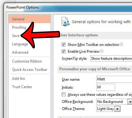 - ΚλικΕκτόςΣτην αριστερή στήλη τουΕπιλογές PowerPointπαράθυρο.