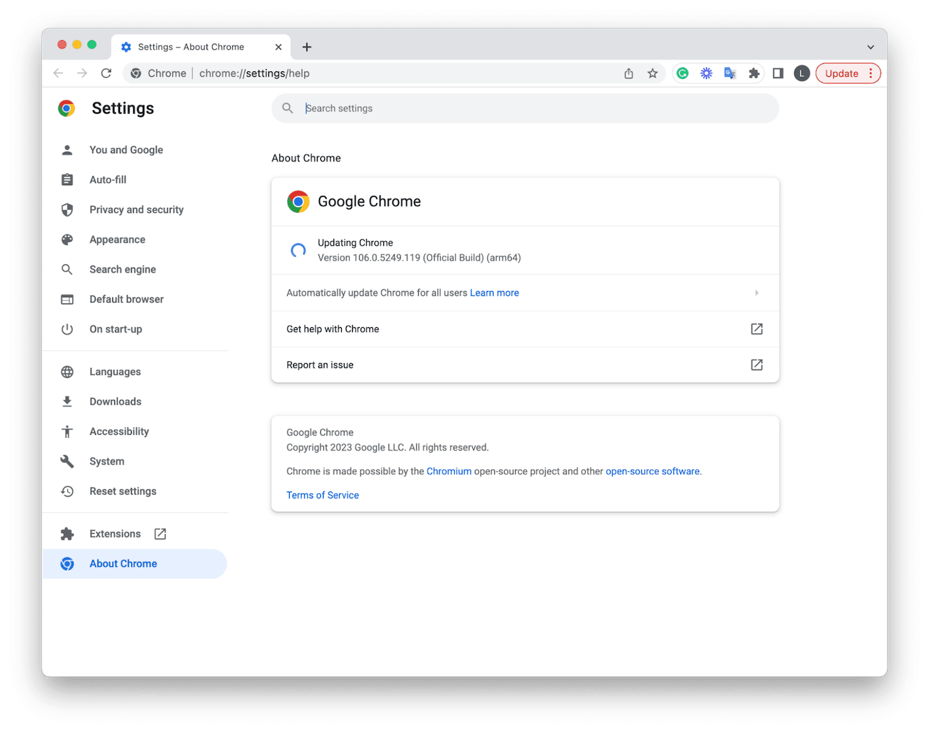 Αξίζει επίσης να ελέγξετε εάν το πρόγραμμα περιήγησής σας είναι ενημερωμένο. Ένα ξεπερασμένο πρόγραμμα περιήγησης θα μπορούσε επίσης να είναι η αιτία αργής ταχύτητας λήψης. Εάν χρησιμοποιείτε το Safari, οι ενημερώσεις του προγράμματος περιήγησης έρχονται με ενημερώσεις MacOS. Για άλλα προγράμματα περιήγησης, απαιτείται κάποια προσπάθεια στο τέλος σας. Για παράδειγμα, μπορείτε να ελέγξετε το Chrome:
