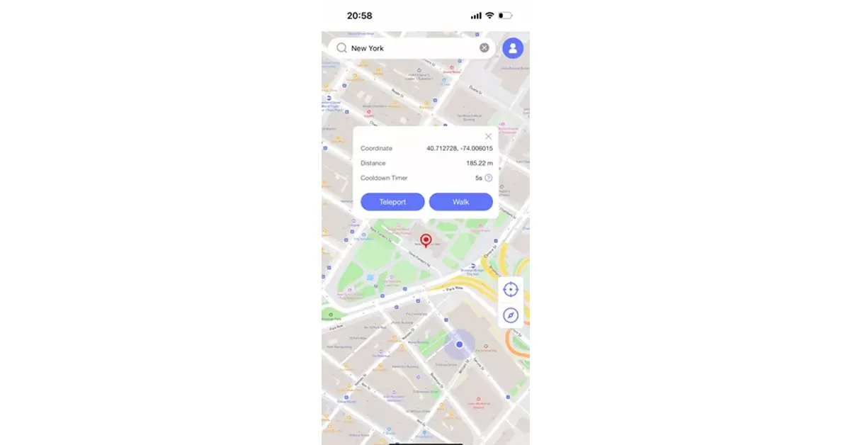Χρησιμοποιήστε τον χάρτη εντός εφαρμογής για να αναζητήσετε μια θέση ή να εισαγάγετε συντεταγμένες. Μπορείτε να τηλεμεταφέρετε αμέσως ή να προσομοιώσετε το περπάτημα ανάμεσα σε πολλαπλά σημεία.