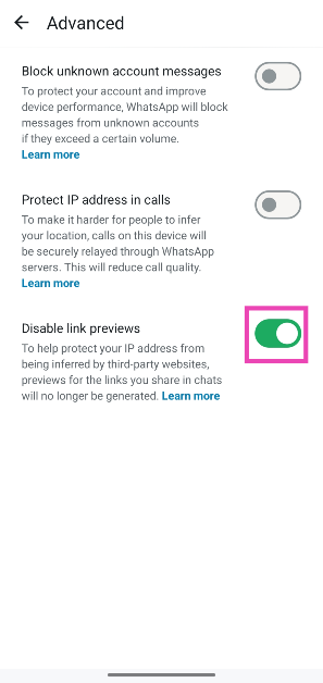 Όταν μοιράζεστε έναν σύνδεσμο σε έναν ιστότοπο στο WhatsApp, είναι σε θέση να συμπεράνετε τη διεύθυνση IP σας από την προεπισκόπηση του συνδέσμου που δημιουργείται στη συνομιλία. Στη συνέχεια, η διεύθυνση IP σας αποθηκεύεται στη βάση δεδομένων του ιστότοπου. Δεδομένου ότι αυτές οι βάσεις δεδομένων είναι συχνά οι στόχοι των επιθέσεων στο διαδίκτυο, είναι καλή ιδέα να απενεργοποιήσετε τις προεπισκοπήσεις συνδέσμων στο WhatsApp.