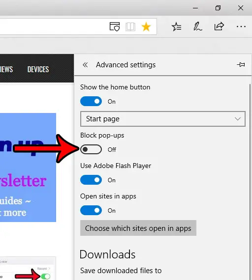 Βήμα 5: Κάντε κλικ στο κουμπί κάτωΑναδυόμενα παράθυραγια να το απενεργοποιήσετε.