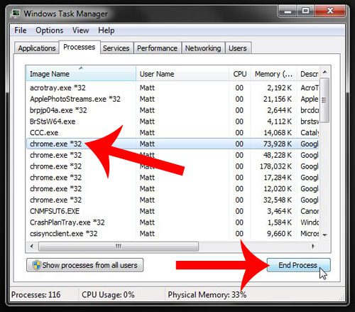 Βήμα 3: Κάντε κλικ σε έναChrome.exe *32διαδικασία, κάντε κλικ στοΤελική διαδικασίακουμπί στην κάτω δεξιά γωνία του παραθύρου και, στη συνέχεια, επιβεβαιώστε ότι θέλετε να τερματίσετε τη διαδικασία. Επαναλάβετε αυτό το βήμα για κάθε επιπλέονChrome.exe *32διαδικασία που βλέπετε.