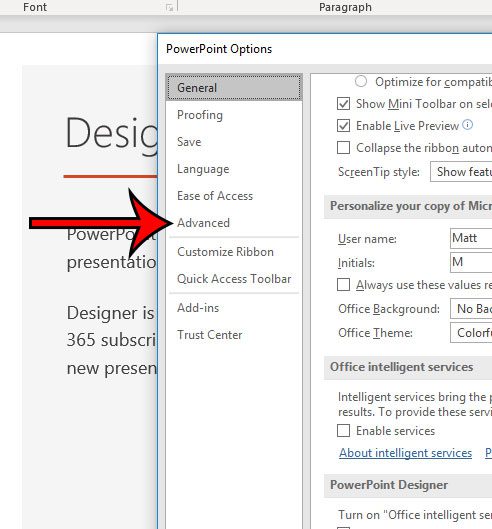 Βήμα 4: Επιλέξτε τοΠροχωρημένοςκαρτέλα στην αριστερή πλευρά τουΕπιλογές PowerPointπαράθυρο.