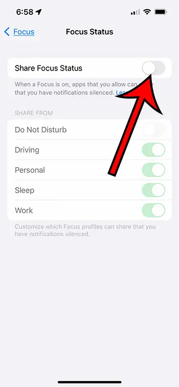 Ο οδηγός μας συνεχίζεται παρακάτω με πρόσθετες πληροφορίες σχετικά με το πώς να σταματήσετε την κοινή χρήση της κατάστασης εστίασης στο iPhone 13, συμπεριλαμβανομένων των εικόνων αυτών των βημάτων.