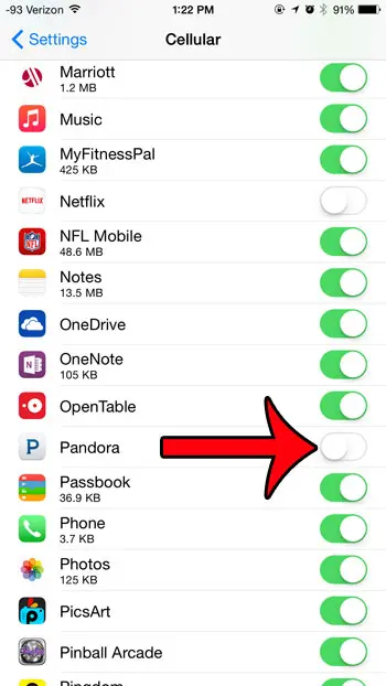 Βήμα 3: Μετακινηθείτε προς τα κάτω και βρείτε τοΠανδώραΕπιλογή και, στη συνέχεια, πατήστε το κουμπί στα δεξιά του για να απενεργοποιήσετε τα κυτταρικά δεδομένα για την εφαρμογή.