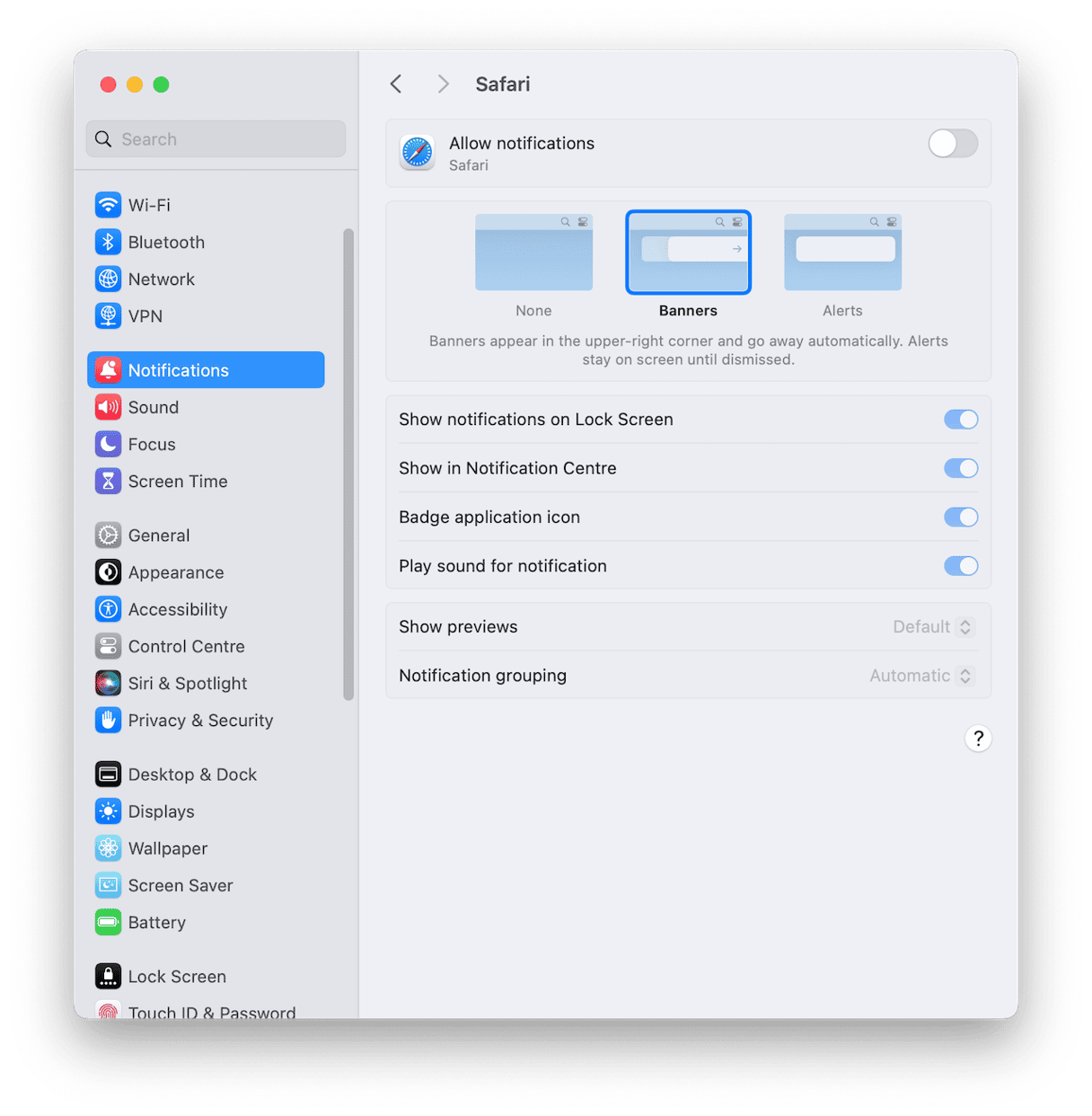 Εάν θέλετε να κάνετε απολύτως βέβαιο ότι δεν έχετε ποτέ ειδοποιήσεις στο Safari, μεταβείτε στις Ρυθμίσεις του Συστήματος> Ειδοποιήσεις και κάντε κλικ στο Safari. Στη συνέχεια, ορίστε τα δικαιώματα ειδοποίησης για να απενεργοποιήσετε.