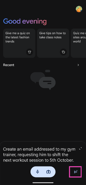 Βήμα 2:Εισαγάγετε έναταχύςγια ένα email. Για παράδειγμα, μπορείτε να ζητήσετε από τον Δίδυμο να δημιουργήσει ένα μήνυμα ηλεκτρονικού ταχυδρομείου που ζητά να επαναπρογραμματίσετε μια συνάντηση.