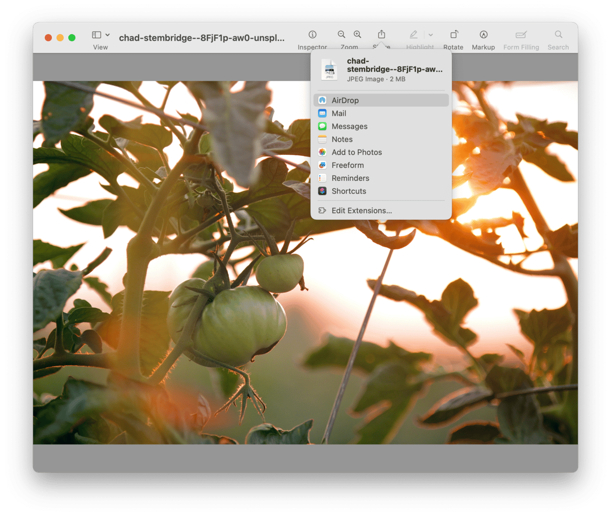 - Ανοίξτε το στοιχείο που θέλετε να μοιραστείτε, κάντε κλικ στο εικονίδιο AirDrop στη γραμμή εργαλείων και, στη συνέχεια, επιλέξτε τη συσκευή λήψης.