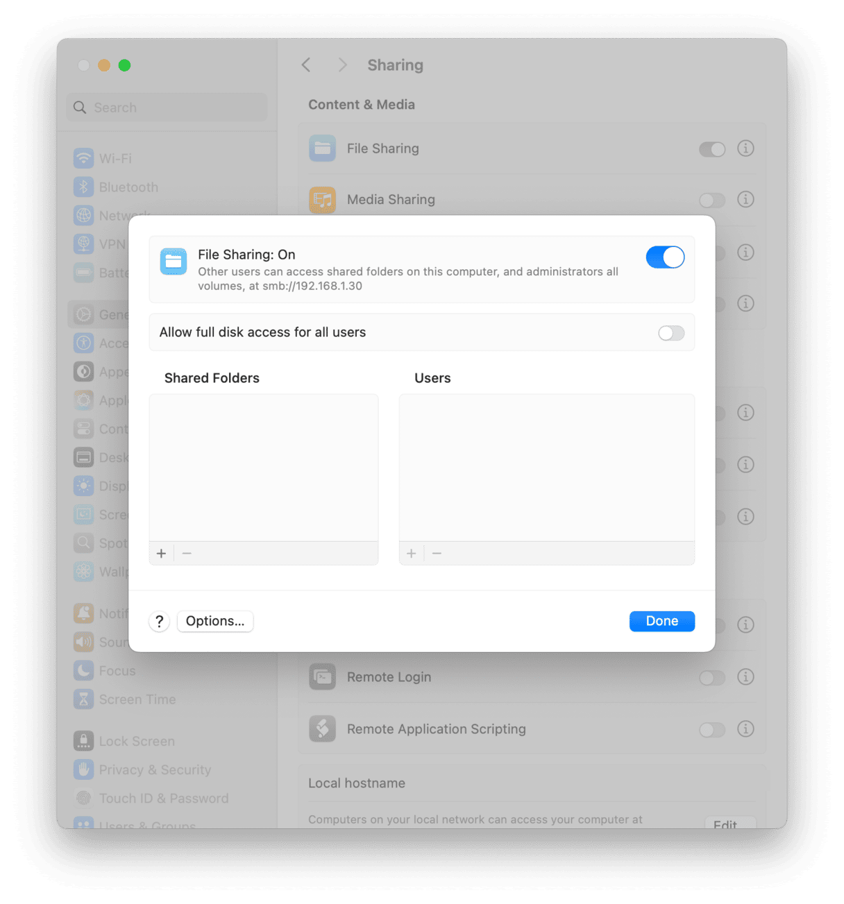 - Κάντε κλικ στο κουμπί INFO δίπλα στην κοινή χρήση αρχείων και ενεργοποιήστε το. Εάν θέλετε να μοιραστείτε ολόκληρο το Mac σας, αφήστε την πλήρη πρόσβαση στο δίσκο.