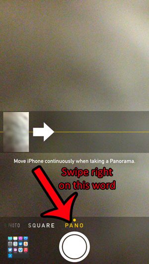 Βήμα 2: Εντοπίστε την επιλογή που λέειΕδώ, στη συνέχεια, σύρετε το δάχτυλό σας προς τα δεξιά σε αυτή τη λέξη για να επιλέξετε μια διαφορετική λειτουργία κάμερας. Οι επιλογές που υπάρχουν σε ένα iPhone 5 περιλαμβάνουν το χρονικό διάστημα, το βίντεο, τη φωτογραφία, το τετράγωνο και το pano. Για να επιστρέψετε στη λειτουργία κανονικής εικόνας, επιλέξτε τοΦωτογραφίαεπιλογή.