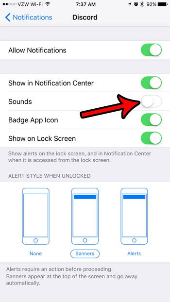 Εάν θέλετε να συνεχίσετε να λαμβάνετε κάποιες ειδοποιήσεις από την εφαρμογή Discord, τότε μπορείτε να αφήσετε την επιλογή Ειδοποιήσεων επιτρέπουν την επιλογή, αλλά αντ 'αυτού απενεργοποιήστε μερικές από τις άλλες επιλογές σε αυτό το μενού. Για παράδειγμα, στην παρακάτω εικόνα, έχω απενεργοποιήσει τις ειδοποιήσεις ήχου από την εφαρμογή Discord, αλλά έχω αφήσει στις άλλες επιλογές, όπως το εικονίδιο της εφαρμογής σήματος, οι ειδοποιήσεις και οι ειδοποιήσεις οθόνης κλειδώματος.