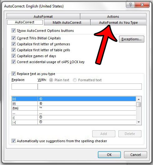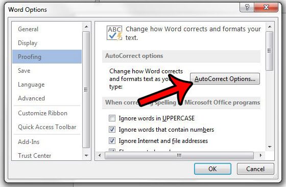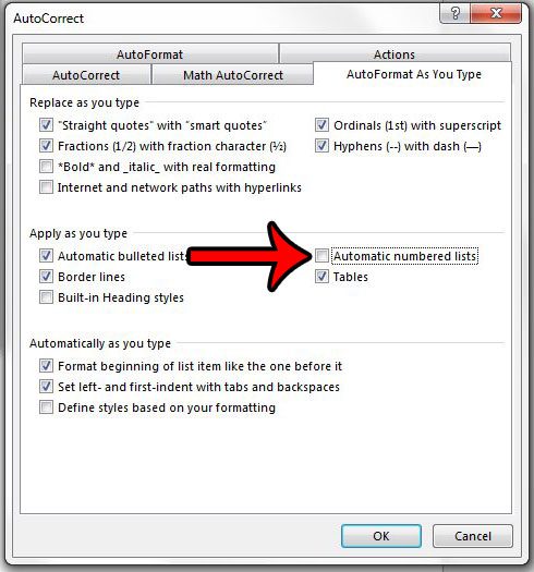 Βήμα 7: Κάντε κλικ στο πλαίσιο στα αριστερά τουΑυτόματες αριθμημένες λίστεςΓια να καταργήσετε το σήμα ελέγχου. Στη συνέχεια, μπορείτε να κάνετε κλικ στοΕΝΤΑΞΕΙκουμπί στο κάτω μέρος του παραθύρου για να αποθηκεύσετε και να εφαρμόσετε τις αλλαγές σας και, στη συνέχεια, κάντε κλικ στοΕΝΤΑΞΕΙκουμπί στο κάτω μέρος τουΕπιλογές λέξεωνΠαράθυρο για να κλείσετε και αυτό το παράθυρο.