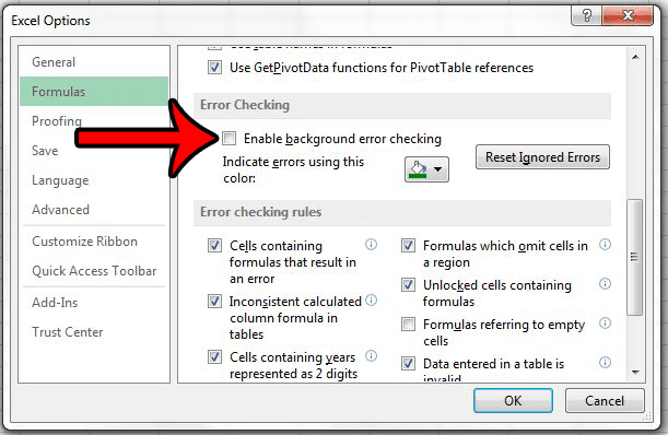 Τα βήματα σε αυτόν τον οδηγό πρόκειται να απενεργοποιήσουν ένα χαρακτηριστικό όπου το Excel ελέγχει για σφάλματα στο παρασκήνιο ενώ εργάζεστε σε ένα υπολογιστικό φύλλο.