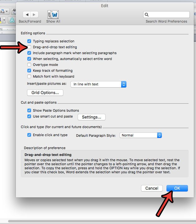 Τα βήματα σε αυτό το άρθρο πραγματοποιήθηκαν με την εφαρμογή Word 2011 για υπολογιστές Mac. Με την απενεργοποίηση αυτής της επιλογής πρόκειται να αποτρέψετε την κίνηση των επιλογών στη λέξη μεταφέροντας και ρίχνοντας τους.