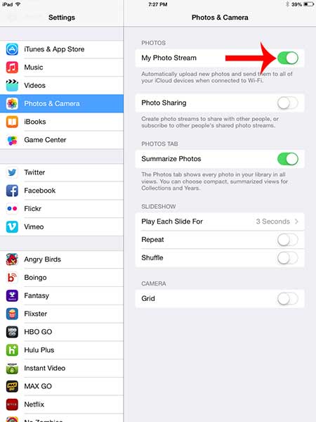 Βήμα 3: Αγγίξτε το κουμπί στα δεξιάΗ ροή φωτογραφιών μουγια να το απενεργοποιήσετε. Εάν η ροή φωτογραφιών είναι ακόμα ενεργοποιημένη, τότε η σκίαση γύρω από το κουμπί θα είναι πράσινη, όπως βρίσκεται στην παρακάτω εικόνα.