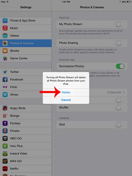 Διαγράψτε τη ροή φωτογραφιών στο iOS 7 σε ένα iPad