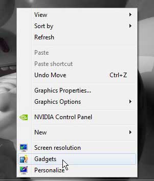 Βήμα 1: Κάντε δεξί κλικ σε ένα κενό σημείο στην επιφάνεια εργασίας σας και, στη συνέχεια, κάντε κλικ στοGadgetsεπιλογή.